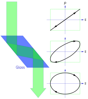 If the incoming light is linearly polarized (plane-polarized), the s and p components are initially in phase; hence, after two reflections, "the p component is 90° ahead in phase",[6] so that the polarization of the emerging light is elliptical with principal axes in the s and p directions (Fig. 1). Similarly, if the incoming light is elliptically polarized with axes in the s and p directions, the emerging light is linearly polarized.