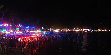 The first Full Moon Party is said to have been improvised at a Paradise Bungalows on the beach in 1983 as a token of thanks to about 20–30 travelers, though the accuracy of this is disputed, as is the date of the original event.[2] The parties gained fame through word of mouth, and the event now draws a crowd of about 5,000–30,000 every full moon evening.[3][4] The party carries on until the sun rises the next day. The bars on Sunrise Beach of Hat Rin stay open and play music such as psychedelic trance, R&B, drum and bass, house, dance, and reggae. The modern event has become a part of the itinerary of many travelers to Southeast Asia.