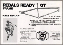 In 1976 Gary Turner begins producing frames for Pedals Ready, a Pro Shop at the Western Sports-A-Rama BMX track in Orange County, California named and marketed as Pedals Ready/GT. These are the first commercially distributed Gary Turner produced frames and one of the first sponsored riders to use them was Greg A. Hill whose father owned the Pedals Ready bike shop. Aware of the popularity of Gary Turner’s BMX frames, Richard Long contacts Turner in 1977 about supplying his Anaheim, California bicycle shop. Turner agrees and the foundation of GT Bicycles is born. These early frames were not yet the GT brand, but were simply called "Gary Turner" as seen by the frame stickers. Things happened fast and soon Richard and Gary invested in a manufacturing warehouse dedicated to making top quality Cro-moly BMX frames in Santa Ana, California. In 1979 they incorporated into GT Bicycles, Inc. GT standing for the initials of its founder, Gary Turner. Richard sold his bike shop and began selling frames as fast as possible to bicycle distributors across the USA and into Europe. Richard headed the business and marketing aspects of the company while Gary was the engineer and production head.