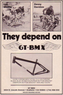 In 1980 GT Bicycles Inc. releases their first bike the “GT Pro” and begins to sponsor BMX racers such as Lee Medlin and Denny Davidow. GT’s first magazine ad appears in Bicycle Motocross Action (BMX Action) in the January 1980 issue.