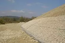 Gabions may be used for attenuating dynamic load as those resulting from impacts by vehicles or rockfall for example. First, gabions may be suitable as a vehicle restraint system in scenic lower speed roads.[11] Second, when used as facing of earth-reinfoced structures with a vertical face, gabions offer a more deformable surface to impact compared to other classical geotechnical alternatives. This higher deformability results from crushing and large displacements of the fill content. As a result, the impact load transmitted to the structure is reduced, due to both impact energy dissipation and peak force attenuation. In an optimization process, the fill material can be adapted to meet specific requirements, in terms of impact response. This in particular led to the use of recylced materials (tires and ballast from railway tracks) in the core of some rockfall protection embankments.[12][13]