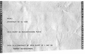 Arman exhibited again in the Iris Clert Gallery in 1961, in an exhibition in which various artists created "portraits" of Iris Clert. Four years after Micro-salon d'Avril, the Iris Clert Gallery returned to a multiple-artist, single-concept exhibition. Arman's portrait consisted of a wall-mounted box filled with various affects taken from Clert's daily life: a high-heel shoe, a personal photograph, lipstick, and various bits of other rubbish. The other notable portrait was done by Robert Rauschenberg. Rauschenberg sent a telegram to the gallery declaring "This is a portrait of Iris Clert if I say so." The "portrait" was initially thrown away, but was later salvaged from the garbage, albeit crumpled up a bit, and put on display.