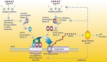 The regulator can be DNA, RNA, protein and complexes of these. The interaction can be direct or indirect (through transcribed RNA or translated protein). In general, each mRNA molecule goes on to make a specific protein (or set of proteins). In some cases this protein will be structural, and will accumulate at the cell membrane or within the cell to give it particular structural properties. In other cases the protein will be an enzyme, i.e., a micro-machine that catalyses a certain reaction, such as the breakdown of a food source or toxin. Some proteins though serve only to activate other genes, and these are the transcription factors that are the main players in regulatory networks or cascades. By binding to the promoter region at the start of other genes they turn them on, initiating the production of another protein, and so on. Some transcription factors are inhibitory.[1]