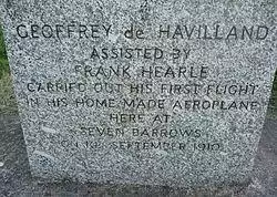 Built with money borrowed from his maternal grandfather,[1] de Havilland's first aircraft took two years to build before he crashed it during its first very short flight at Seven Barrows near Litchfield, Hampshire in December 1909.[2] He built a fresh biplane, making his first flight in it from a meadow near Newbury in September 1910.[3] A memorial plaque presently marks the event. Subsequent designs were even more successful: in 1912 he established a new British altitude record of 10,500 feet (3.2 km) in an aircraft of his design, the B.E.2. Geoffrey was the designer and his brother Hereward was the test pilot.