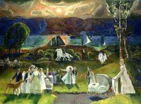 Bellows taught at the Art Institute of Chicago in 1919. In 1920, he began to spend nearly half of each year in Woodstock, New York, where he built a home for his family.[18] He died on January 8, 1925 in New York City, of peritonitis, after failing to tend to a ruptured appendix.[19] He was survived by his wife, Emma Story Bellows (married 1910), and daughters Anne and Jean. Bellows is buried at Green-Wood Cemetery in Brooklyn.