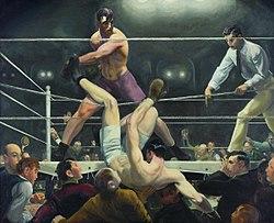 Bellows' urban New York scenes depicted the crudity and chaos of working-class people and neighborhoods, and satirized the upper classes. From 1907 through 1915, he executed a series of paintings depicting New York City under snowfall. In these paintings Bellows developed his strong sense of light and visual texture,[14] exhibiting a stark contrast between the blue and white expanses of snow and the rough and grimy surfaces of city structures, and creating an aesthetically ironic image of the equally rough and grimy men struggling to clear away the nuisance of the pure snow. However, Bellows' series of paintings portraying amateur boxing matches were arguably his signature contribution to art history.[11] They are characterized by dark atmospheres, through which the bright, roughly lain brushstrokes of the human figures vividly strike with a strong sense of motion and direction.