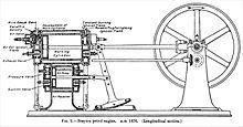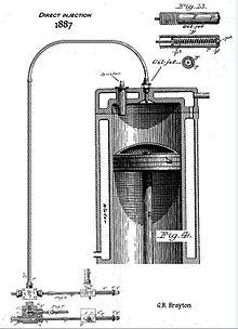 In 1872 George Brayton patented a constant pressure internal combustion engine, initially using vaporized gas but later using liquid fuels such as kerosene and oil, known as Brayton's Ready Motor,[1][2] The engine used one cylinder for compression, a receiver reservoir, and a separate power/expander cylinder in which the products of combustion expanded for the power stroke. The significant difference from other piston driven internal combustion engines is that the two cylinders are arranged so that the fuel/air mixture burns progressively at constant pressure as it is transferred from the compressor cylinder and reservoir to the working/expansion cylinder. In the original version a gas/air mixture was created by a vapor carburetor,[3] then compressed and stored in a reservoir where it was ignited and then introduced into an expansion cylinder. A metal gauze/mesh was used to prevent the combustion running back to the reservoir. However at times the mesh failed, leading to flash-back or explosion. In 1874 Brayton filed a patent for a liquid fuel injection system. In this version, fuel was introduced as the air passed into the expansion cylinder, thus eliminating the explosion problem.[2] Ignition remained a pilot flame. The principle was referred to as constant pressure combustion, and had been attempted without success by Sir William Siemens c1861 using a 4-cylinder engine with a separate combustion chamber. Brayton not only achieved success in making the constant pressure cycle work, but he also made and marketed a commercial product.