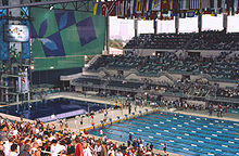 Georgia Tech's athletic center began at its current location in 1977 as the Student Athletic Center, or SAC.[1] Later, Georgia Tech was chosen as the site of the 1996 Summer Olympics aquatic venue, and the Aquatic Center was constructed next to the SAC. The Aquatic Center cost $16.8 million, and featured competitions in swimming, synchronized swimming, diving, water polo, and the swimming segment of the modern pentathlon competition.[2][3][4] The stadium had a capacity of 14,600 at the time. It also had a temporary pool for the water polo competitions seating 4,000.