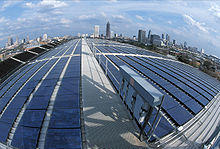The Campus Recreation Center is a very modern building in many ways. The roof over the competition pool is entirely covered in Georgia Tech Research Institute-designed solar panels, which produce electricity (up to 340 kilowatts, averaging about 400 megawatt-hours per year) to supplement the Georgia Tech power grid, and also heat pool water which is pumped through pipes in the roof.[6][7]