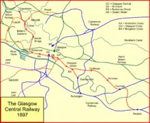 The Glasgow Central Railway was a railway line built in Glasgow, Scotland by the Caledonian Railway, running in tunnel east to west through the city centre. It was opened in stages from 1894 and opened up new journey opportunities for passengers and enabled the Caledonian Railway to access docks and industrial locations on the north bank of the River Clyde. An intensive and popular train service was operated, but the long tunnel sections with frequent steam trains were smoky and heartily disliked.
