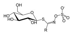 Glucosinolates constitute a natural class of organic compounds that contain sulfur and nitrogen and are derived from glucose and an amino acid. They are water-soluble anions and belong to the glucosides. Every glucosinolate contains a central carbon atom, which is bound via a sulfur atom to the thioglucose group and via a nitrogen atom to a sulfate group (making a sulfated aldoxime). In addition, the central carbon is bound to a side group; different glucosinolates have different side groups, and it is variation in the side group that is responsible for the variation in the biological activities of these plant compounds. The essence of glucosinolate chemistry is their ability to convert into an isothiocyanate (a "mustard oil") upon hydrolysis of the thioglucoside bond by the enzyme myrosinase.[3]
