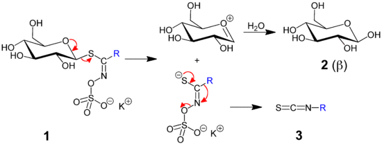 In the chemical reaction illustrated above, the red curved arrows in the left side of figure are simplified compared to reality, as the role of the enzyme myrosinase is not shown. However, the mechanism shown is fundamentally in accordance with the enzyme-catalyzed reaction.
