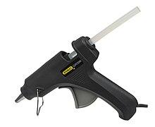 Hot adhesives, also known as hot melt adhesives, are thermoplastics applied in molten form (in the 65–180 °C range) which solidify on cooling to form strong bonds between a wide range of materials. Ethylene-vinyl acetate-based hot-melts are particularly popular for crafts because of their ease of use and the wide range of common materials they can join. A glue gun (shown at right) is one method of applying hot adhesives. The glue gun melts the solid adhesive, then allows the liquid to pass through its barrel onto the material, where it solidifies.