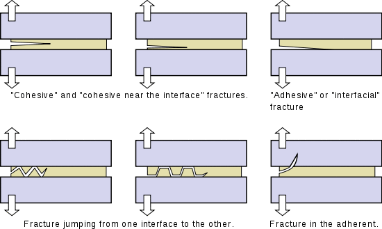 Adhesive fracture (sometimes referred to as interfacial fracture) is when debonding occurs between the adhesive and the adherend. In most cases, the occurrence of adhesive fracture for a given adhesive goes along with smaller fracture toughness.