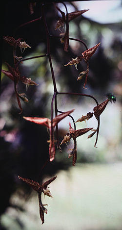 All species in this genus are epiphytes with a sympodial growth. The white aerial roots are very thin, growing in a dense pack. Some roots even grow upright instead of hanging down. This specialisation helps in forming the ball of aerial roots. Many are found in association with ant nests.