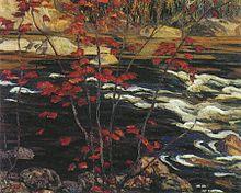 The informal group was temporarily split up during World War I, during which Jackson[9] and Varley[10] became official war artists. Jackson enlisted in June 1915 and served in France from November 1915 to 1917, at which point he was seriously injured.[11] Harris enlisted in 1916 and taught musketry at Camp Borden.[12] He was discharged in May 1918 after suffering a nervous breakdown.[12][13] Carmichael, MacDonald, Thomson, Varley and Johnston remained in Toronto and struggled in the depressed wartime economy.[12][nb 1] A further blow to the group came in 1917 when Thomson died mysteriously while canoeing in Algonquin Park. The circumstances of his death remain unclear.[1]