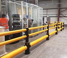In 1992 a yellow polymer cover sleeve for steel guardrails was introduced by a Detroit-based company[9] which enhanced the visibility of steel safety guardrails in industrial environments and removed the need for continual repainting.[10] This polymer cover was the beginning of polymer guardrail in the industrial environment. At the turn of the 21st century, several companies developed safety products constructed with polymer designed specifically for industrial environments and in 2001 a dedicated industrial alternative to steel guardrail was invented by a British-based company, and thus the first fixed flexible polymer safety guardrail was introduced to the market.[11][12] In the early 2000s, an Italian company added a version of a polymer bumper[13] providing small bumpers for walls and equipment in the food industry. A Belgian company also introduced a flexible barrier in 2010[14] and in 2014 a US based company introduced a hybrid polymer-steel guardrail for industrial environments.[15]