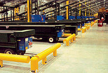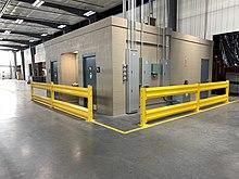 The term "guardrail" as used in industry and distribution facilities refers to floor mounted systems consisting of horizontal rails attached to upright posts that resemble outdoor highway guardrail. The facility safety guardrails control in-plant vehicular traffic and protect areas where errant vehicle contact may cause harm to property or personnel.[8] Common uses for guardrail systems may be along an aisle or building wall. Often guardrails are placed around equipment installations to prevent inadvertent contact from lift trucks. The guardrail provides a safety barrier preventing lift trucks or other in-plant vehicles from traveling into equipment, building walls, or personnel.