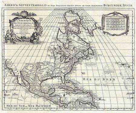 The map does not have much detail for the Carolina region, shown as extending into present-day Tennessee and Kentucky. For example, there is a flawed conception of the Appalachians as reaching into the Michigan peninsula, an error potentially borrowed from earlier maps by Morden Brown or Sanson.[15] The largest area of the map by far was "La Louisiane", or Louisiana. This was a France-centric version of the continent, intended to convey that the colony was firmly established colony by 1718. The colony consisted of between four hundred to seven hundred men, women, and children clustered around the mouth of the Mississippi.[13]:41 The map labeled major waterways and copper mines which could serve to boost the nation's commerce.[13]:41 It was considered to be a politically charged document that also depicted explorers’ routes and controversial territorial claims in the New World.