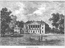 The "Small Mansion" was built virtually alongside in around 1806–1809, the builders evidently recognising the suitability of the position – an elevated terrace overlooking the horseshoe-lake near where the original mansion had stood. The small mansion and grounds were known as "Gunnersbury House".[10]