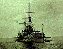 HMS Formidable was laid down at Portsmouth Dockyard on 21 March 1898 and launched on 17 November 1898; she was, at the time of her launching, very incomplete, and she was launched primarily to clear the slipway so construction could begin on the battleship London. Formidable was completed in September 1901, and was commissioned at Portsmouth on 10 October for service in the Mediterranean Fleet. Captain Alexander William Chisholm-Batten paid off HMS Resolution on 9 October and he and his crew turned over to Formidable on the following day.[3] In September 1902 she visited the Aegean sea with other ships of the station for combined manoeuvres near Nauplia,[4] and the following year she was escort ship to the royal yacht HMY Victoria and Albert when the King visited the Mediterranean.[5] She began a refit at Malta in 1904 which lasted until April 1905, and in April 1908 transferred to the Channel Fleet.[6][7]