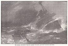 At around 03:05, U-24 launched another torpedo at the stricken Formidable, hitting her again on the starboard side close to her bow. Topaze, joined by Diamond, began the rescue effort, but the heavy seas made it very difficult to bring men aboard. Formidable remained afloat for another hour and forty minutes, and at 04:45 began to capsize and sink by the bow. She remained afloat, with her stern in the air, for a few minutes before sinking. Loxley was last seen on the bridge calmly overseeing the evacuation of the ship. Diamond picked up thirty-seven officers and crew from the water.[12][11] The Brixham trawler Provident picked up 73 members of Formidable's crew from the battleship's launch at around midday, while Formidable's pinnace managed to reach Lyme Regis after 22 hours at sea, saving another 47 men.[13] A total of 35 officers and 512 men were killed in the sinking.[11][14]