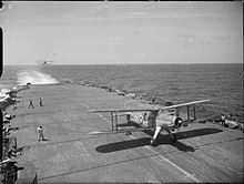 Several weeks later, she made a cautious transit of the recently mined Suez Canal and reached Alexandria on 10 March.[24] 829 Squadron was issued Fairey Swordfish torpedo bombers to replace its losses around this time.[25] On 20 March Formidable escorted a convoy to Malta and flew off five aircraft for Crete while returning to Alexandria. On the morning of 27 March, major elements of the Italian Fleet were spotted en route to the sea lanes between Egypt and Greece, and the carrier sailed later that afternoon to intercept them. Reinforced by three Fulmars from 806 Squadron, her air group only numbered 13 Fulmars, 10 Albacores and 4 Swordfish. An Albacore spotted the leading Italian ships the next morning; a strike force of six Albacores was loaded with torpedoes and began to attack the Italian battleship Vittorio Veneto. Two German Junkers Ju 88 bombers intervened, but they were driven off by the escorting pair of Fulmars. The attack was unsuccessful, and another strike force of three Albacores and two Swordfish was prepared. Shortly after launching them at 12:22, Formidable was unsuccessfully attacked by a pair of torpedo-carrying Savoia-Marchetti SM.79 bombers. Around 14:50, one Albacore succeeded in torpedoing the Italian battleship, although the other aircraft missed. The hit briefly knocked out her engines and caused heavy flooding. Another air strike of six Albacores and two Swordfish was launched at 17:30 to finish off the crippled battleship, but they mistook the Italian cruiser Pola for the battleship in the fading light. The cruiser was struck by a single torpedo from one of the aircraft, possibly from one of two Swordfish from 815 Squadron from Maleme, Crete, that linked up with Formidable's aircraft before the attack. The mistake allowed the battleship to reach port. One Albacore was shot down by Vittorio Veneto, and two others were forced to ditch after running out of fuel during the day's operations.[26]