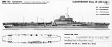 Formidable had a length of 740 feet (225.6 m) overall and 710 feet (216.4 m) at the waterline. Her beam was 95 feet 9 inches (29.2 m) at the waterline and she had a draught of 28 feet 10 inches (8.8 m) at deep load. She displaced 23,000 long tons (23,369 t) at standard load as completed.[4] Her complement was approximately 1,299 men upon completion in 1940.[5] The ship had three Parsons geared steam turbines, each driving one shaft, using steam supplied by six Admiralty 3-drum boilers. The turbines were designed to produce a total of 111,000 shp (83,000 kW), enough to give a maximum speed of 30.5 knots (56.5 km/h; 35.1 mph).[6] On sea trials, Formidable reached 30.6 knots (56.7 km/h; 35.2 mph) with 112,018 shp (83,532 kW).[7] She carried a maximum of 4,850 long tons (4,930 t) of fuel oil, which gave her a range of 10,700 nautical miles (19,800 km; 12,300 mi) at 10 knots (19 km/h; 12 mph).[4]