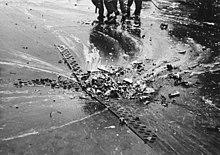 The detonation of the bomb put a large dent in the flight deck, around 24 feet (7.3 m) by 20 feet (6.1 m) and 2 feet (0.61 m) deep, with a 2 square feet (0.19 m2) hole in the center and much spalling from the underside.[54][55] It killed 2 officers and 6 ratings, wounding 55 other crewmen.[51] A fragment from the flight deck armour penetrated the hangar deck armour and passed through the centre boiler uptakes, the centre boiler room itself, and an oil tank before it came to rest in the inner bottom. The fragment severed the steam pipes in the centre boiler room and forced its evacuation, cutting the ship's speed to 14 knots (26 km/h; 16 mph). The blast on the flight deck blew the Avenger closest to it over the side and set another one on fire. Shrapnel from the blast peppered the island, causing the bulk of the casualties, and severed many electrical cables, including those for most of the ship's radars.[56] The fires on the flight deck and in the hangar were extinguished by 11:55, and seven Avengers and a Corsair which were damaged beyond repair were dumped over the side.[51] The bomb struck at the intersection of three armour plates and dented the plates over an area 20 by 24 feet (6.1 by 7.3 m). The dent was filled by wood and concrete and covered by thin steel plates tack-welded to the deck so that she was able to operate aircraft by 17:00 and steam at a speed of 24 knots (44 km/h; 28 mph). Thirteen of her Corsairs had been airborne at the time of the attack and they operated from the other carriers for a time. The damage to the boiler room and its steam pipes was repaired so that the centre boilers could be reconnected to the engines at 02:00 the next day.[57]