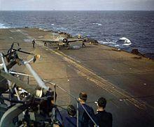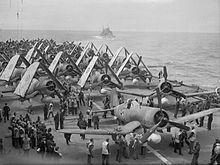 Together with Victorious and King George V, Formidable departed Sydney on 28 June, bound for the BPF's advance base at Manus Island, in the Admiralty Islands. Her air group now consisted of 36 Corsairs, 12 Avengers and 6 Grumman F6F Hellcats of 1844 Squadron. Two of the latter aircraft were photoreconnaissance versions.[64] No. 6 Naval Fighter Wing was absorbed into the 2nd Carrier Air Group that controlled all of the aircraft on the carrier.[65] The ships arrived on 4 July, refuelled, and departed two days later to join the American Third Fleet, already operating off the Japanese Home Islands. The BPF rendezvoused with the Americans on 16 July and commenced operations the next morning. Formidable flew off 28 Corsairs bound north of Tokyo on 17 July, but some of them were unable to locate their targets because of bad weather. Twenty-four Corsairs attacked targets near Tokyo the next day, before more bad weather halted flying operations until 24–25 July, when the BPF's aircraft attacked targets near Osaka and the Inland Sea, crippling the escort carrier Kaiyo.[66] After replenishing, airstrikes resumed on 28 and 30 July, sinking the escort Okinawa near Maizuru. A combination of bad weather, refuelling requirements and the atomic bombing of Hiroshima delayed the resumption of air operations until 9 August.[67]