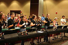 A handbell choir or ensemble (in the United States) or handbell team (in England) is a group that rings recognizable music with melodies and harmony, as opposed to the mathematical permutations used in change ringing. The bells generally include all notes of the chromatic scale within the range of the set. While a smaller group uses only 25 bells (two octaves, G4–G6), the sets are often larger, ranging up to an eight-octave set (97 bells, C1–C9). The bells are typically arranged chromatically on foam-covered tables; these tables protect the bronze surface of the bell, as well as keep the bells from rolling when placed on their sides. Unlike an orchestra or choir in which each musician is responsible for one line of the texture, a handbell ensemble acts as one instrument, with each musician responsible for particular notes, sounding his or her assigned bells whenever those notes appear in the music.