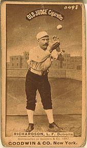 In his 14 years in major league baseball, Richardson appeared in 1,334 major league games, compiled a .299 batting average and .437 slugging percentage, and totaled 1,127 runs scored, 1,694 hits, 305 doubles, 126 triples, 73 home runs, 828 RBIs, and 377 bases on balls.[1] His best season was 1886 when he led the National League in home runs and compiled a 7.0 Wins Above Replacement (WAR) rating, the fourth highest among all position players in the National League. His career WAR rating was 40.5.[1]