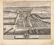 - Politician and philosopher, Henry St John, 1st Viscount Bolingbroke (1678–1751),[14] of Dawley House. Alexander Pope describes his friend Bolingbroke, the noble farmer who had engaged a painter for £200 to give the correct agricultural air to his country hall by ornamenting it with trophies of spades, rakes, and prongs.[15] Bolingbroke bought Dawley for £22,000 in 1724, moved there in 1725. With help from Charles Bridgeman he worked on the 400 acres of park and 20 acres of garden, making a ferme ornée, while James Gibbs beautified the house.[16] He sold it in 1737, or 1738, for £26,0000 to Edward Stephenson (1691–1768), MP for Sudbury 1734–41, and for two days Governor of Fort William, 1728,[17] who passed it on again soon after 1748;[13]