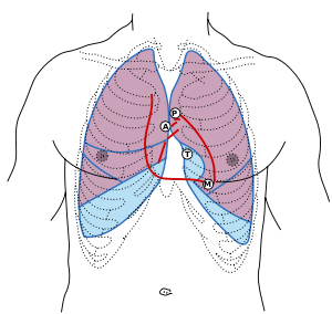 The aortic area, pulmonic area, tricuspid area and mitral area are areas on the surface of the chest where the heart is auscultated.[4] Heart sounds result from reverberation within the blood associated with the sudden block of flow reversal by the valves closing. Because of this, auscultation to determine function of a valve is usually not performed at the position of the valve, but at the position to where the sound waves reverberate.