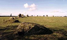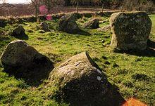 Some of the stones have designs (spirals, circles, grooves and cup-marks) on them which may have indicated the presence of other monuments or gathering-places and/or signalled the trackways and other routes through the landscape, particularly through the river valleys to sources of food, to ritual gathering places, or to sources of axes.[21][22]