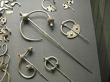Bronze Age artefacts have been uncovered throughout the county, including several bronze axe heads around Kendal and Levens, an axe and a sword at Gleaston, a rapier near the hamlet of Salta, an intriguing carved granite ball near Carlisle and part of a gold necklace believed to be from France or Ireland found at Greysouthen. A timber palisade has also been discovered at High Crosby near Carlisle. Again, there is continuity between Bronze-age and Neolithic practice of deposition. There seems to be an association between the distribution of stone perforated axe-hammers and bronze metalwork deposition in the area of Furness.[32] Of the approximately 200 bronze implements found in Cumbria, about half have been found in the Furness and Cartmel region. Most are flanged axes (21), and flanged spearheads (21), palstaves (20), and flat and socketed axes (16 each).[33] Early Bronze Age metalwork distribution is largely along communication valleys (such as the Eden valley), and on the Furness and West Cumbrian plains, with evidence on the west coast (for example, a find at Maryport) of connections with Ireland.[34] In the Middle Bronze Age, deposition seems to have switched from burials to wet places, presumably for ritualistic reasons. In the Late Bronze Age, socketed axe finds are the most common (62), but are rare in West Cumbria, which also lacks finds of the angle-flanged type.[35] Hoards (two or more items) of deposited Bronze Age metalwork are rare in Cumbria, (notably at Ambleside, Hayton, Fell Lane, Kirkhead Cave, Skelmore Heads), for reasons that are still being discussed. Most are from the Middle Bronze Age period.