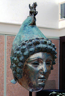 Evidence of burial practices is extremely rare. Inhumations have been found at Risehow, and possibly at Butts Beck (crouched individuals in pits and ditches) as well as two very rare cemeteries with multiple individuals (only approximately 30 Iron Age cemeteries exist in Britain in total) at Nelson Square, Levens and at Crosby Garrett.[52] The Butts Beck burial included the body of a 'warrior' along with his weapons and a horse (although this might have been a horse and cart burial, rather than a warrior one, with the wooden cart having rotted away).[53] The bog body at Scaleby[54] and the one at Seascale[55] are difficult to date, and, since the excavations were done in the 19th century and lacked today's archaeological techniques, the evidence for Druidical ritual sacrifice, as appears with some other bog bodies in Britain and Europe, is not present in the Cumbrian examples. However, both bodies were buried with a wooden stick or wand, which conforms to other bog-burial practice elsewhere. The finding of stone heads at Anthorn and at Rickerby Park, Carlisle, also conforms to the Celtic cult of the severed head and ritualistic sacrifice. This may be true also of the bronze buckets or cauldrons deposited at Bewcastle and at Ravenstonedale[56] which indicate connections with Ireland. The early name of Carlisle, 'Luguvalium', meaning 'belonging to Luguvalos', suggests a tribal chief in charge who had a personal name that meant 'strong as Lugus'. This indicates a possible affinity of the tribe there (perhaps the Carvetii) to the Celtic god Lugus, whose festival, Lugnasad, occurred on 1 August, accompanied by various sacrifices.