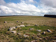 Most of the population, the total size of which at its peak has been estimated at between 20,000–30,000 people,[84] lived in scattered, but not isolated, communities, usually consisting of just a single family group. They practised mixed agriculture, with enclosures for arable use, but also with enclosed and unenclosed pasture fields.[85] During the second half of the Roman occupation, there seems to have been a move from agricultural land to pasture and 'waste' with building of walls and barriers – perhaps due either to a fall-off in demand for grain locally, consequent on the decline of the Roman military establishment, or to a drop in productivity.[86]