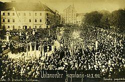Following the dissolution of Austro-Hungarian Empire in the aftermath of the World War I, a National Council of Slovenes, Croats and Serbs took power in Zagreb on 6 October 1918. On 29 October independence was declared by a national gathering in Ljubljana, and by the Croatian parliament, declaring the establishment of the new State of Slovenes, Croats and Serbs. On 1 December 1918 the State of Slovenes, Croats and Serbs merged with Serbia, becoming part of the new Kingdom of Serbs, Croats and Slovenes, itself being renamed in 1929 to Kingdom of Yugoslavia.