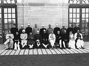 The first Cabinet of independent India: (L to R sitting) B.R. Ambedkar, Rafi Ahmed Kidwai, Sardar Baldev Singh, Maulana Abul Kalam Azad, Jawaharlal Nehru, Rajendra Prasad, Sardar Patel, John Mathai, Jagjivan Ram, Amrit Kaur and Syama Prasad Mukherjee. (L to R standing) Khurshed Lal, R.R. Diwakar, Mohanlal Saksena, N. Gopalaswami Ayyangar, N.V. Gadgil, K. C. Neogy, Jairamdas Daulatram, K. Santhanam, Satya Narayan Sinha and B. V. Keskar.