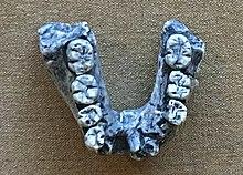 Fossils have generally been classified into H. rudolfensis due to large skull size, flatter and broader face, broader cheek teeth, more complex tooth crowns and roots, and thicker enamel compared to H. habilis.[27] Early Homo are characterised by larger teeth compared to later Homo. The cheek teeth of KNM-ER 60000, a jawbone, in terms of size are on the lower end for early Homo, except for the third molar which is within range. The molars increase in size towards the back of the mouth. The tooth rows of KNM-ER 1470, KNM-ER 60000, and KNM-ER 62000 are rectangular, whereas the tooth row of KNM-ER 1802 is U-shaped, which may indicate that these two morphs represent different species,[13] or demonstrate the normal range of variation for H. rudolfensis jaws.[6] In UR 501 from Uraha, Malawi—the oldest H. rudolfensis specimen dating to 2.5–2.3 mya—the tooth enamel thickness is the same as in other early Homo, but the enamel on the molars is almost as thick as Paranthropus molars (which have some of the thickest enamel of any hominin). Such a wide variation in enamel thickness across the cheek teeth is not exhibited in KNM-ER 1802, which may indicate regional differences among H. rudolfensis populations.[27][28]