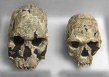 In 2003, Australian anthropologist David Cameron concluded that the earlier australopithecine Kenyanthropus platyops was the ancestor of rudolfensis, and reclassified it as K. rudolfensis. He also believed that Kenyanthropus was more closely related to Paranthropus than Homo.[11] In 2008, a re-reconstruction of the skull concluded it was incorrectly restored originally, though agreed with the classification as H. rudolfensis.[12] In 2012, British palaeoanthropologist Meave Leakey described the juvenile partial face KNM-ER 62000 discovered in Koobi Fora, Kenya; noting it shares several similarities to KNM-ER 1470 and is smaller, she assigned it to H. rudolfensis, and, because prepubescent male and female bones should be indistinguishable, differences between juvenile H. rudolfensis and adult H. habilis specimens support species distinction. She also concluded that the jawbone KNM-ER 1802, an important specimen often used in classifying other specimens as H. rudolfensis, actually belongs to a different (possibly undescribed) species,[13] but American palaeoanthropologist Tim D. White believes this to be premature because it is unclear how wide the range of variation is in early hominins.[6] The 2013 discovery of the 1.8 Ma Georgian Dmanisi skulls which exhibit several similarities with early Homo have led to suggestions that all contemporary groups of early Homo in Africa, including H. habilis and H. rudolfensis, are the same species and should be assigned to H. erectus.[14][15] There is still no wide consensus on how rudolfensis and habilis relate to H. ergaster and descendent species.[16]