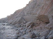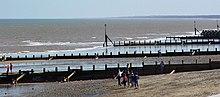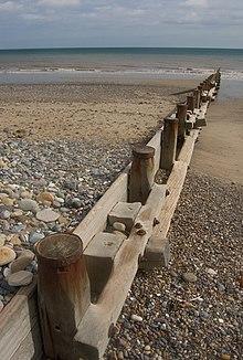 The coast at Hornsea is subject to erosion. The rate of erosion varies, but has been inferred at around 4 yards (3.7 m) per year in the latter part of the 16th century; estimated by George Poulson at 2 yards (1.8 m) per year in the late 18th century, though recorded at up to 6 yards (5.5 m) in some years in the same period.[16] The rate of erosion may have been influenced by the presence or absence of erosion limiting groynes or a pier. South, at Hornsea Burton erosion rates rose from 1.3 to 5 yards (1.2 to 4.6 m) pa between the periods 1845–76 and 1876–82, thought to be due to the construction of groynes north of the beach at Hornsea.[17] The current (2008) rate of erosion is 1 foot 8 inches (0.5 m) north of and 6 feet 7 inches (2 m) south of Hornsea – the difference due to the defences at Hornsea preventing the renewing flow of sediment southwards.[5]