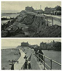New sea defences were constructed c. 1907 following a destructive storm on the east coast in March 1906. The timber defences were destroyed or damaged by the storm with most of the beach swept away, and a large amount of cliff eroded exposing the underlying clay. The new defences at Hornsea were constructed north of New Road protecting the seafront at Marine Terrace and Victoria Gardens. The works consisted of four groynes plus a concrete sea wall reinforced by steel pile supports. The work was carried out by A. Fasey and Son (Leytonstone) under W.T. Douglas of Westminster.[94] The sea wall was lengthened by 450 and 1,240 feet (140 and 380 m) to the north and south respectively in 1923, and extended south beyond the stream dike outlet of the mere in 1930.[73]