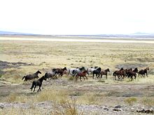 In bands, there is usually a single "herd" or "lead" stallion, though occasionally a few less-dominant males may remain on the fringes of the group.[20] The reproductive success of the lead stallion is determined in part by his ability to prevent other males from mating with the mares of his harem. The stallion also exercises protective behavior, patrolling around the band, and taking the initiative when the band encounters a potential threat.[21] The stability of the band is not affected by size, but tends to be more stable when there are subordinate stallions attached to the harem.[22]