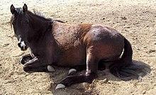 Horses must lie down to reach REM sleep. They only have to lie down for an hour or two every few days to meet their minimum REM sleep requirements.[36] However, if a horse is never allowed to lie down, after several days it will become sleep-deprived, and in rare cases may suddenly collapse as it involuntarily slips into REM sleep while still standing.[39] This condition differs from narcolepsy, which horses may suffer from.[37]