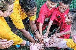 In Association football (soccer), the huddle has been used before games by Brazil and the Ireland national teams and club teams such as Derry City FC. Celtic FC from Scotland have used the huddle as a pre-match ritual since 1995, although this was pre-dated by St. Mirren FC (also from Scotland) who had been using the huddle since 1993. Celtic copied this and in turn is now carried out by all levels and ages of the Celtic club and often imitated by the supporters. The supporting visual aspect of this, although culturally unrelated can also be seen as similar to The Poznan.