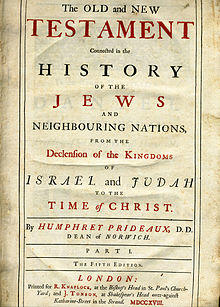 The Old and New Testament connected in the History of the Jews and Neighbouring Nations (1715–17)[9] was a significant work, of which many editions were brought out; it drew on James Ussher.[2] It was among the earliest English works to use the term Vulgar Era,[10][11] though Kepler used the term as early as 1635.[12] It covered the historical interval between the Old and New Testaments, and led to a controversy between Prideaux and his cousin, Walter Moyle. Jean Le Clerc wrote a critical examination of it, which was published in English in 1722.[13] The French translation was by Moses Solanus and Jean-Baptiste Brutel de la Rivière.[14]