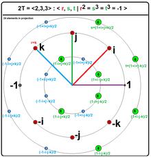 The group of units in L is the order 8 quaternion group Q = {±1, ±i, ±j, ±k}. The group of units in H is a nonabelian group of order 24 known as the binary tetrahedral group. The elements of this group include the 8 elements of Q along with the 16 quaternions {(±1 ± i ± j ± k)/2}, where signs may be taken in any combination. The quaternion group is a normal subgroup of the binary tetrahedral group U(H). The elements of U(H), which all have norm 1, form the vertices of the 24-cell inscribed in the 3-sphere.