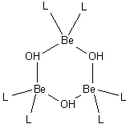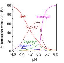 Beryllium hydroxide Be(OH)2 is amphoteric.[16] The hydroxide itself is insoluble in water, with a solubility product log K*sp of −11.7. Addition of acid gives soluble hydrolysis products, including the trimeric ion [Be3(OH)3(H2O)6]3+, which has OH groups bridging between pairs of beryllium ions making a 6-membered ring.[17] At very low pH the aqua ion [Be(H2O)4]2+ is formed. Addition of hydroxide to Be(OH)2 gives the soluble tetrahydroxoberyllate/tetrahydroxidoberyllate anion, [Be(OH)4]2−.
